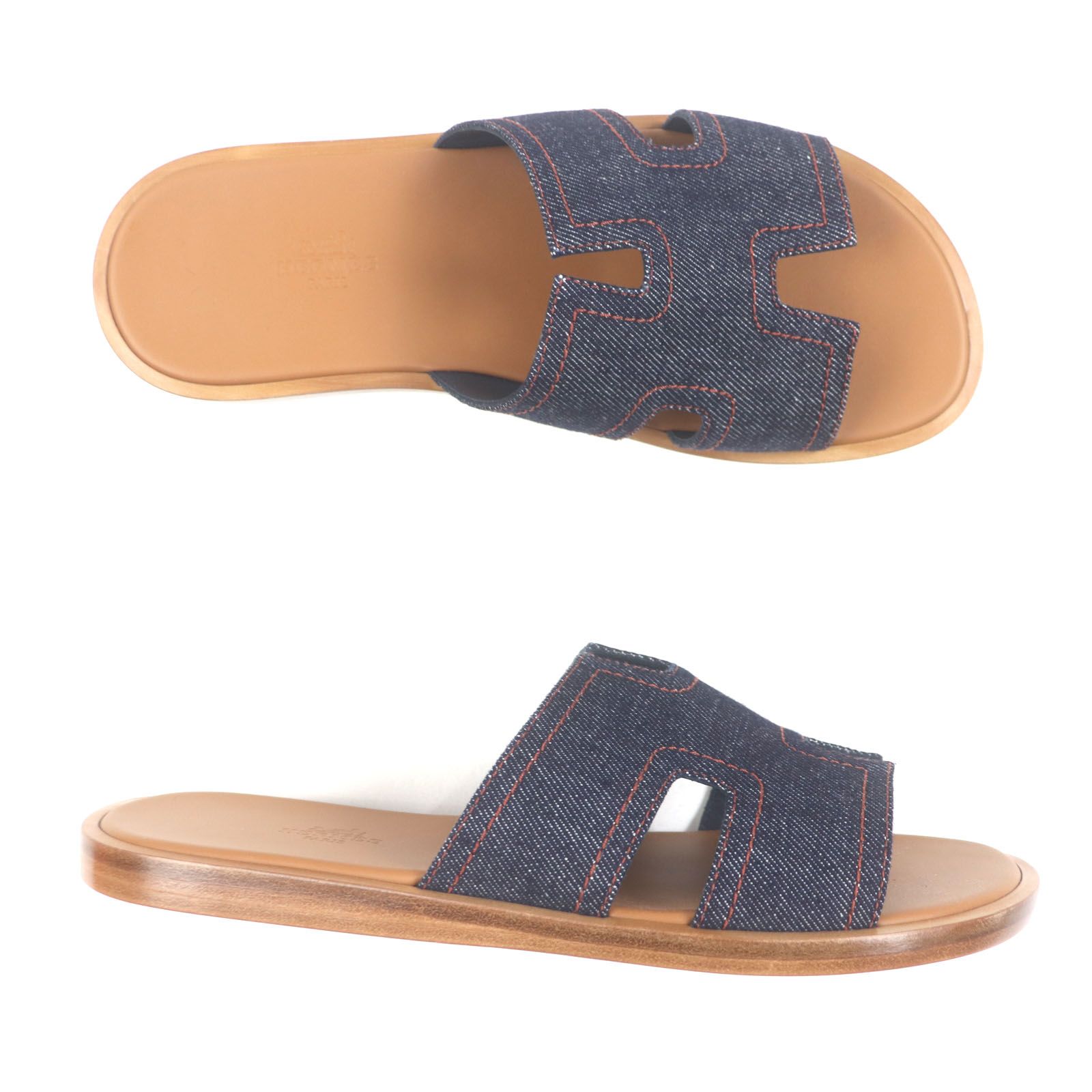 HERMES エルメス イズミール デニム レザー 品 スライドサンダル インディゴ ブラウン 40 箱 保存袋付き イタリア製 メンズ