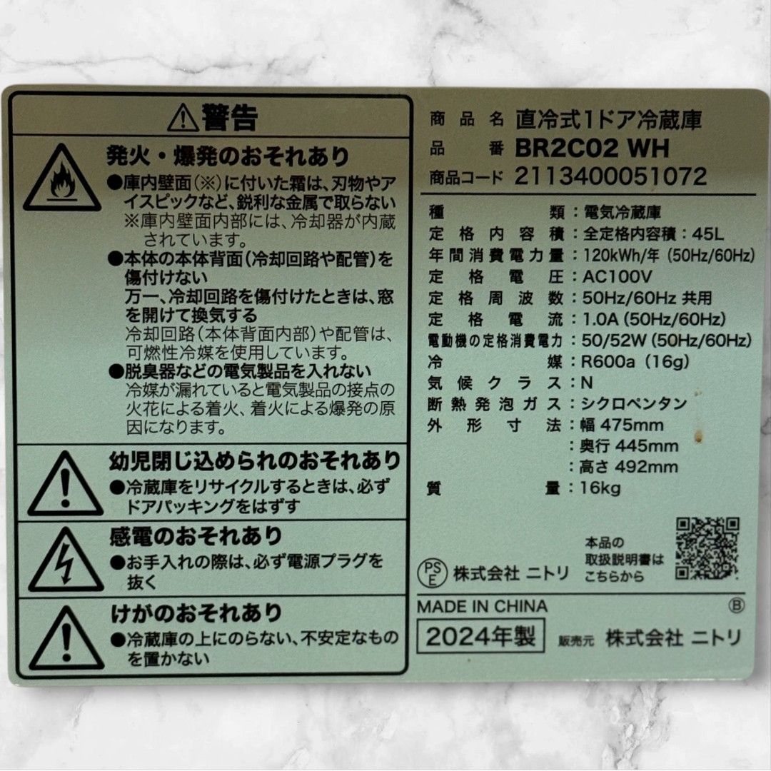 ニトリ NITORI 1ドア直冷式冷蔵庫 45 L コンパクトモデル 製 BR 2 C 02 WH