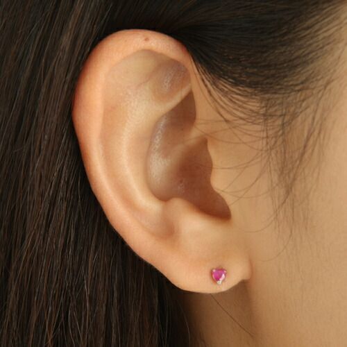 耳たぶにポチッと大きいハートのルビーにドキッ☆ハートシェイプカットのルビーを3つの爪が抱きかかえ、存在感をばっちりアピールしています。なんといってもこのカラット数に驚いてください!計0.2ctものピアスなんです!
