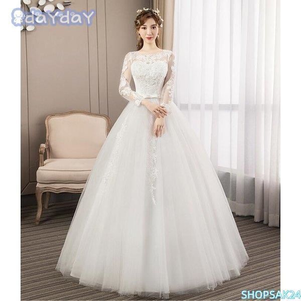 ウエディングドレス ロング 白 豪華 お呼ばれ 袖あり 肩隠し袖隠し レース 上品着痩せ 結婚式 二次会 演奏会 花嫁 披露宴 撮影 編み上げ式685