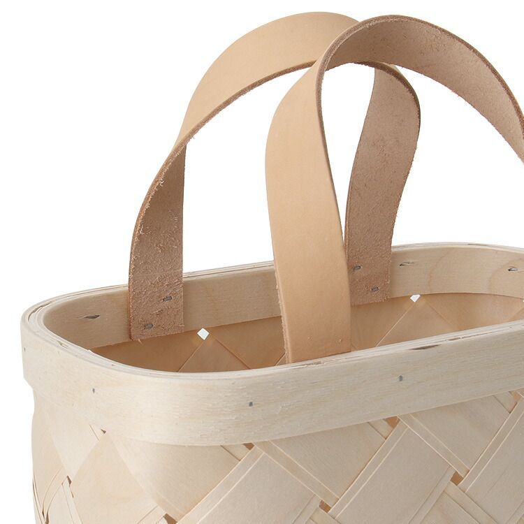 二枚の白樺を重ね、職人の手によって丁寧に編み上げられたバスケット。ハンドメイドならではのあたたかみと、ハンドルのレザーがアクセントととなり上品な仕上がり。様々なシーンでご使用いただけます。