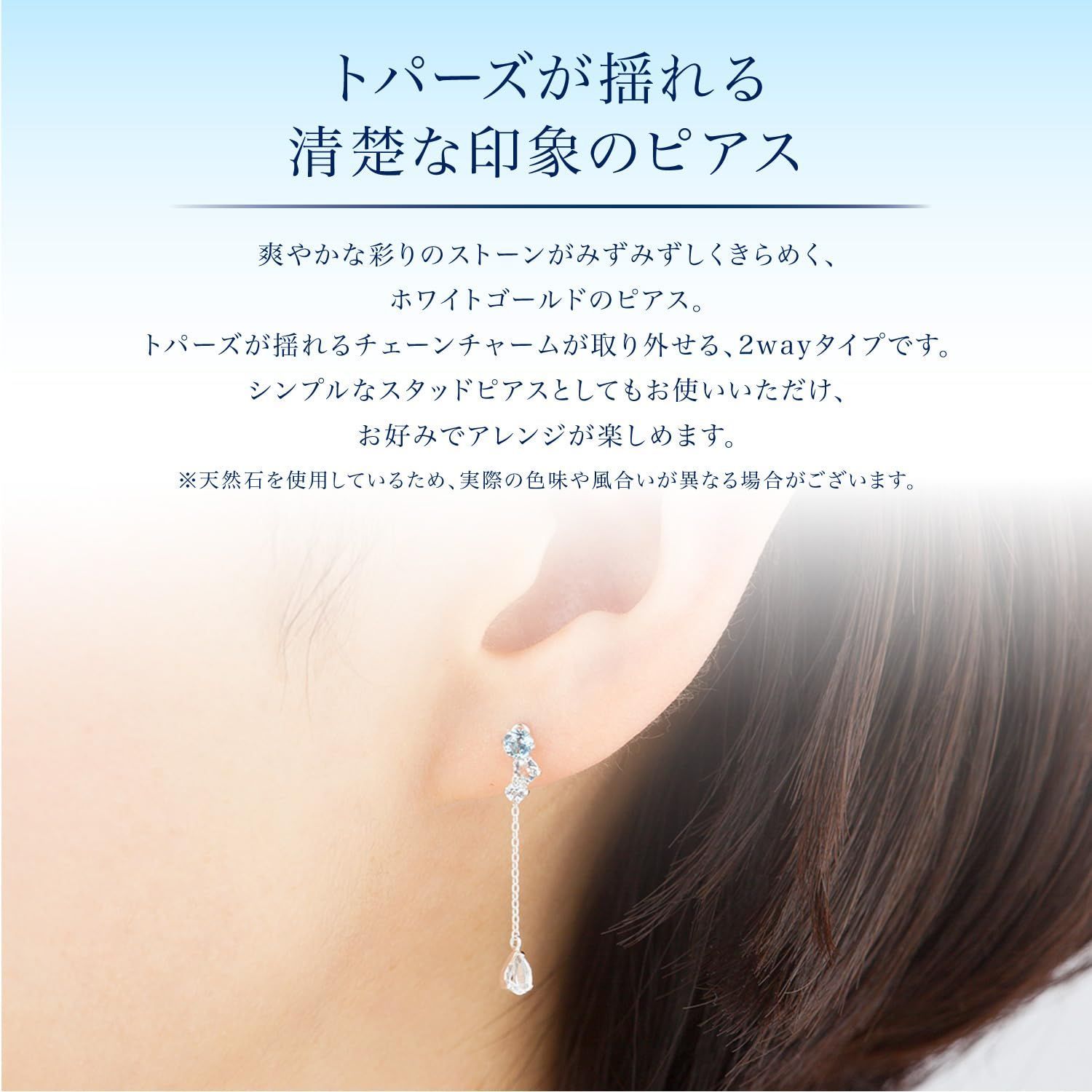 爽やかな彩りのストーンがみずみずしくきらめく、ホワイトゴールドのピアス。トパーズが揺れるチェーンチャームが取り外せる、2wayタイプです。シンプルなスタッドピアスとしてもお使いいただけ、お好みでアレンジが楽しめます。