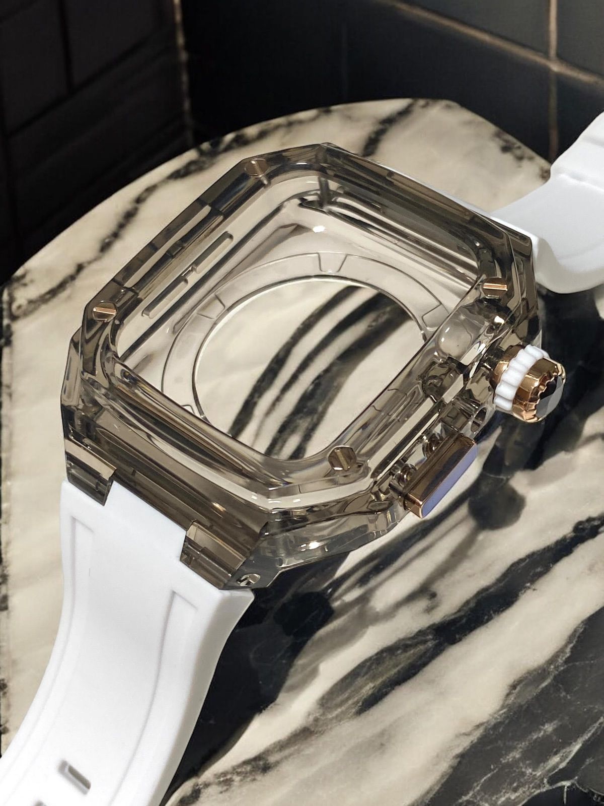 クラウンには透明度と輝きが美しいジルコニアが装飾され、ラバーは一際柔らかくバックルはダイヤモンドメタルカットをセットしています。